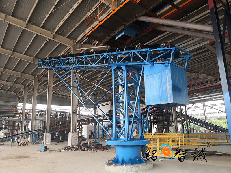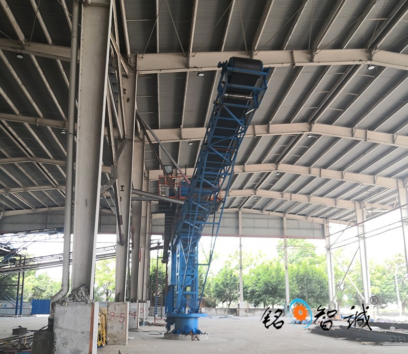 旋轉(zhuǎn)式皮帶輸送機,為散碎物料倉貯輸送設備,是在安裝有行走輪的支架上部的底盤上安裝一轉(zhuǎn)盤,轉(zhuǎn)盤可相對底盤作旋轉(zhuǎn)運動,皮帶輸送機的進料端座在轉(zhuǎn)盤頂部的托盤上,出料端為懸臂式,配重箱在托盤上用以上與懸臂配重,倉貯時,物料通過料斗由輸送帶送至遠端,推動懸臂即可改變堆積位置,在庫房內(nèi)實現(xiàn)多點堆積而勿需停機和移動機體,連續(xù)作業(yè)省時省力,操作方便,尤其適用于糧食的倉貯輸送。